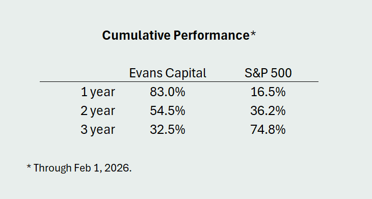 The table shows the cumulative performance for Evans Capital Partners and the S&P 500, net of fees, for the past 1, 2 and 3 years, through February 1, 2026.