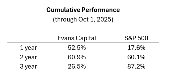 The table shows the cumulative performance for Evans Capital Partners and the S&P 500, net of fees, for the past 1, 2 and 3 years, through Oct 1, 2025.
