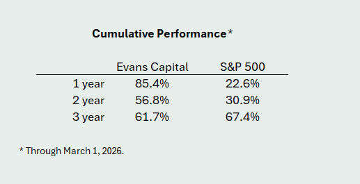 The table shows the cumulative performance for Evans Capital Partners and the S&P 500, net of fees, for the past 1, 2 and 3 years, through March 1, 2026.