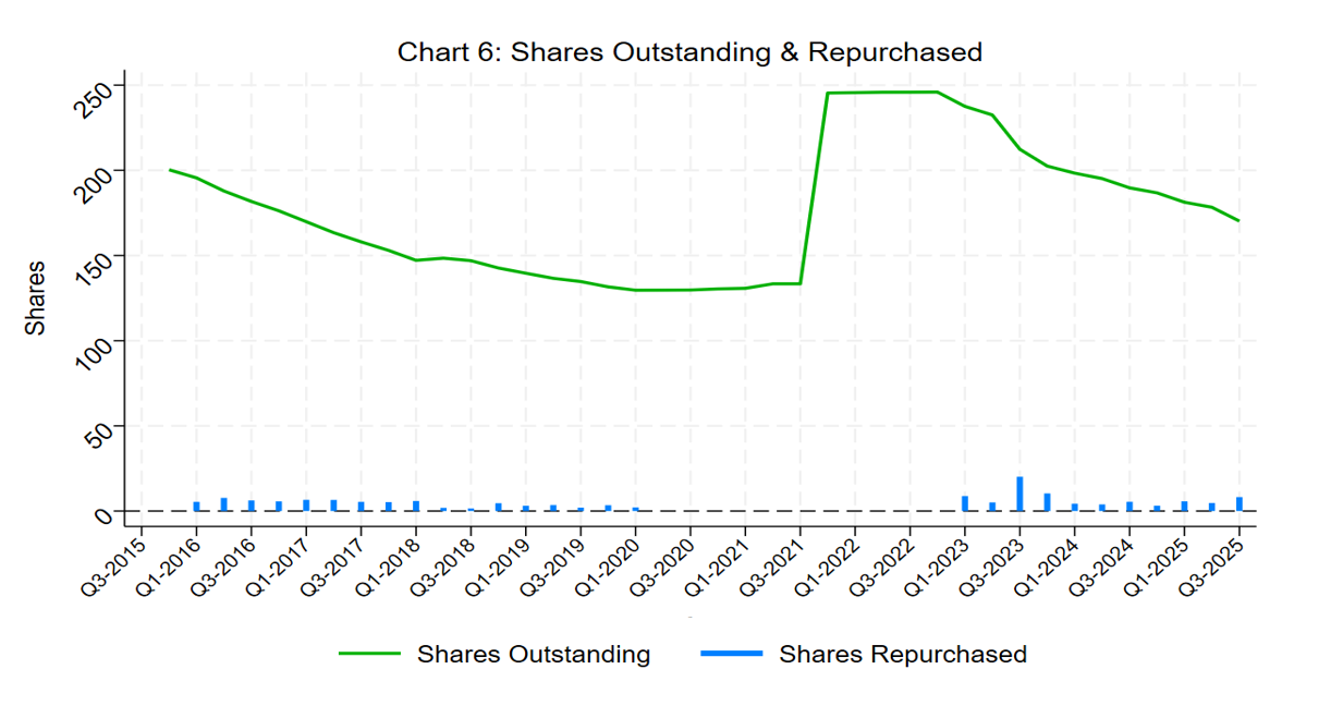 The following chart presents past shares outstanding and repurchases. This spike in shares outstanding in 2021 was the result of the GECAS merger in 2021 (see the next section).